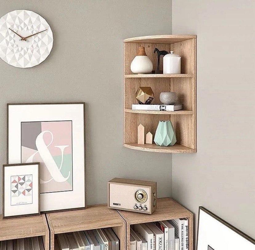 Ця функціональна кутова полиця має простий однотонний дизайн і тому легко вписується в наявну концепцію житлового приміщення.